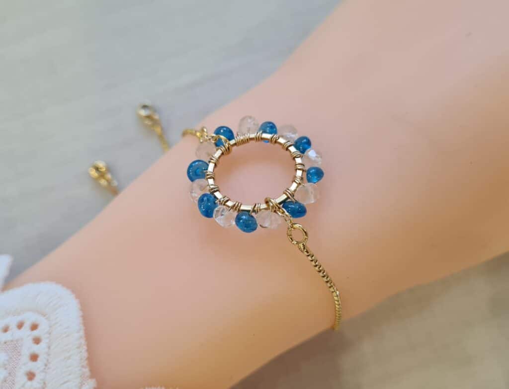 Bracelet Apatite ajustable dont le motif rond est orné de perles d’Apatite d’un beau bleu électrique et de Topaze blanche en alternance. Un petit bijou féminin et original, de taille universelle grâce à la taille de chaîne réglable. Un bijou qui sera le cadeau idéal, à (s’)offrir sans modération !